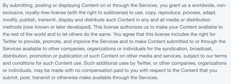 A snippet of Twitter’s Terms of Service. Twitter can do whatever it likes with what you post.