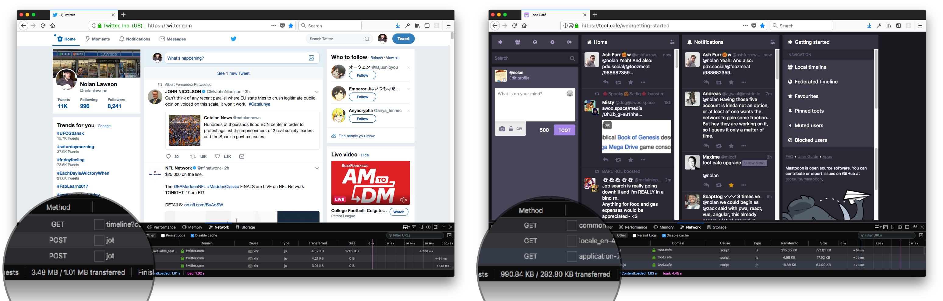 Screenshots of Twitter vs Mastodon, showing Twitter loading 3.48MB of JS vs 990.84KB on Mastodon